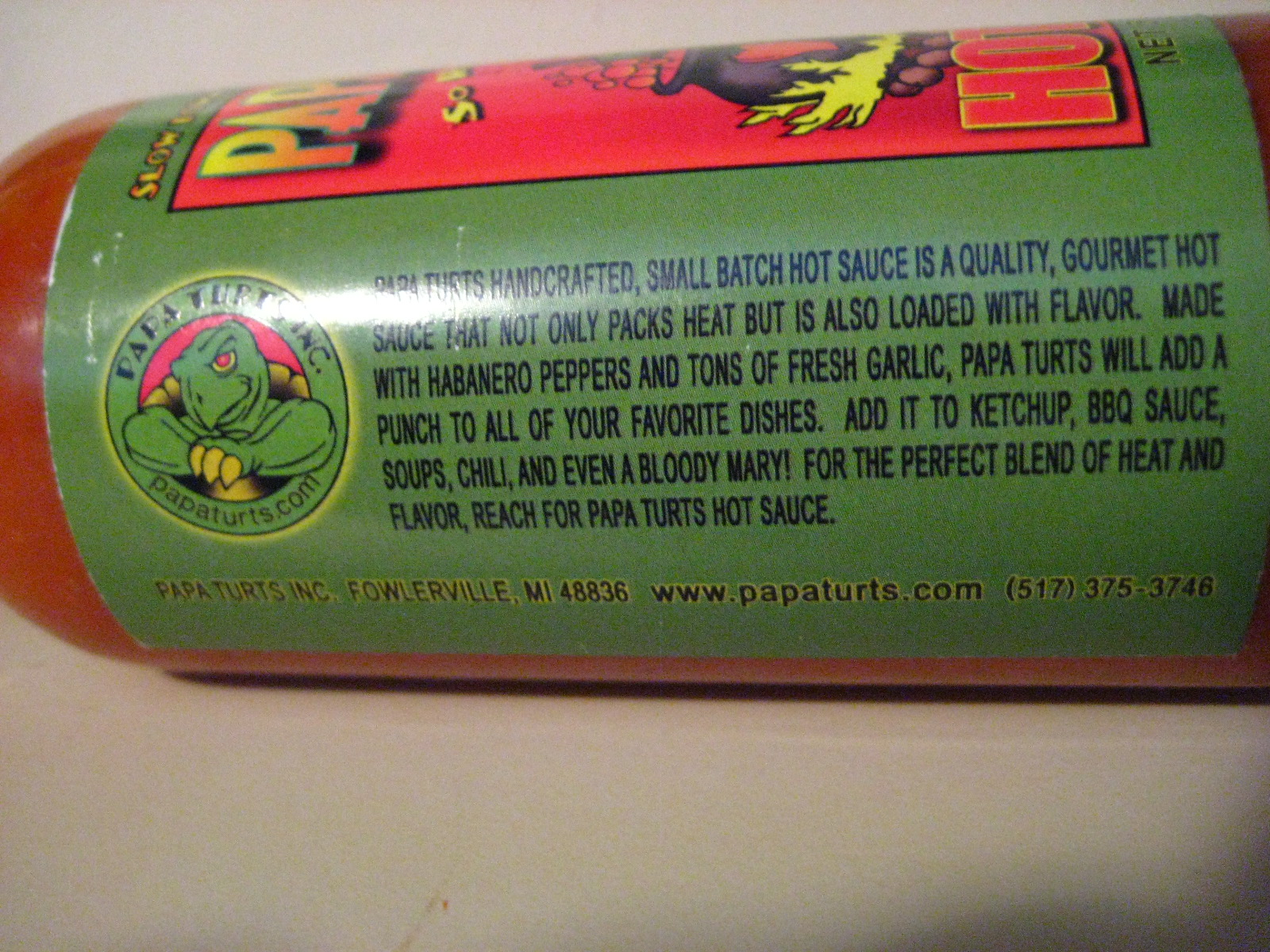 Welcome back for another Rudy Review! Today I’m taking a look at a hot sauce made in my home state of Michigan from a company named Papa Turts. Papa Turts is run by a couple named Matt and Mandy and they named their company after Matt’s nickname. His nickname was originally “Turtle”, but after they had their child, one of Matt’s friend started calling him “Papa Turts” and the name stuck. After asking their friends what the name of the company should be, someone suggested “Papa Turts, so hot it hurts!” and they thought it was a perfect name.